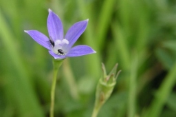ヒナキキョウ 北アメリカ原産の一年草で、道端で見られる。先端部に開放花で、 それより下は閉鎖花。日本産のヒナギキョウは、先端の開放花のみ、 茎の途中で枝分かれがある。 帰化種のキキョウソウは茎の途中でも開放花あり |