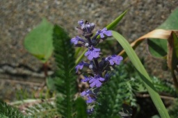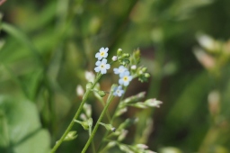 | キュウリグサ 春に青色の 小さい5弁花が咲く。 花は、それぞれにズラリと 伸ばした短い茎先に咲く (下の方から上の方に 咲きあがっていく)。 ・葉っぱをもんでみると、 キュウリのような匂いがする。 (名前の由来) 勿忘草になた花です |