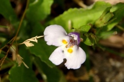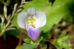 トキハハゼ 1年草。北海道〜九州の人里近くに生える。 茎は根元に集まり、葉の間から少数の枝をだし高さ6〜20cm。 サギゴケ科サギゴケ属. 花は唇形花で淡紫色。下唇に黄色と赤褐色の斑紋がある |