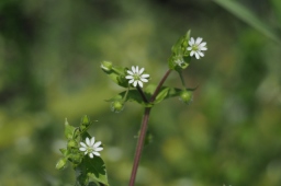 | ハコベ 2~9月に咲くナデシコ科の花。 田畑や畦道、道端、荒れ地などに生息する多年草。 花言葉は「初恋の思い出」。茎のつけ根に花径4~6ミリの、 小さな白い五弁花をつける。 細い花びらが10枚あるように見えるが、これは5枚の花びらが それぞれ2つに切れている |